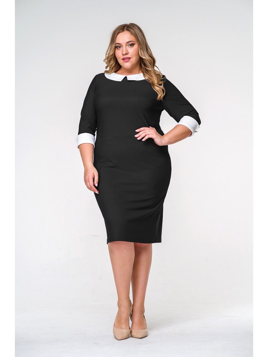 Офисное платье полуприлегающего силуэта из однотонного черного джерси. Воротник и манжеты белого цвета. Рукав 3/4.