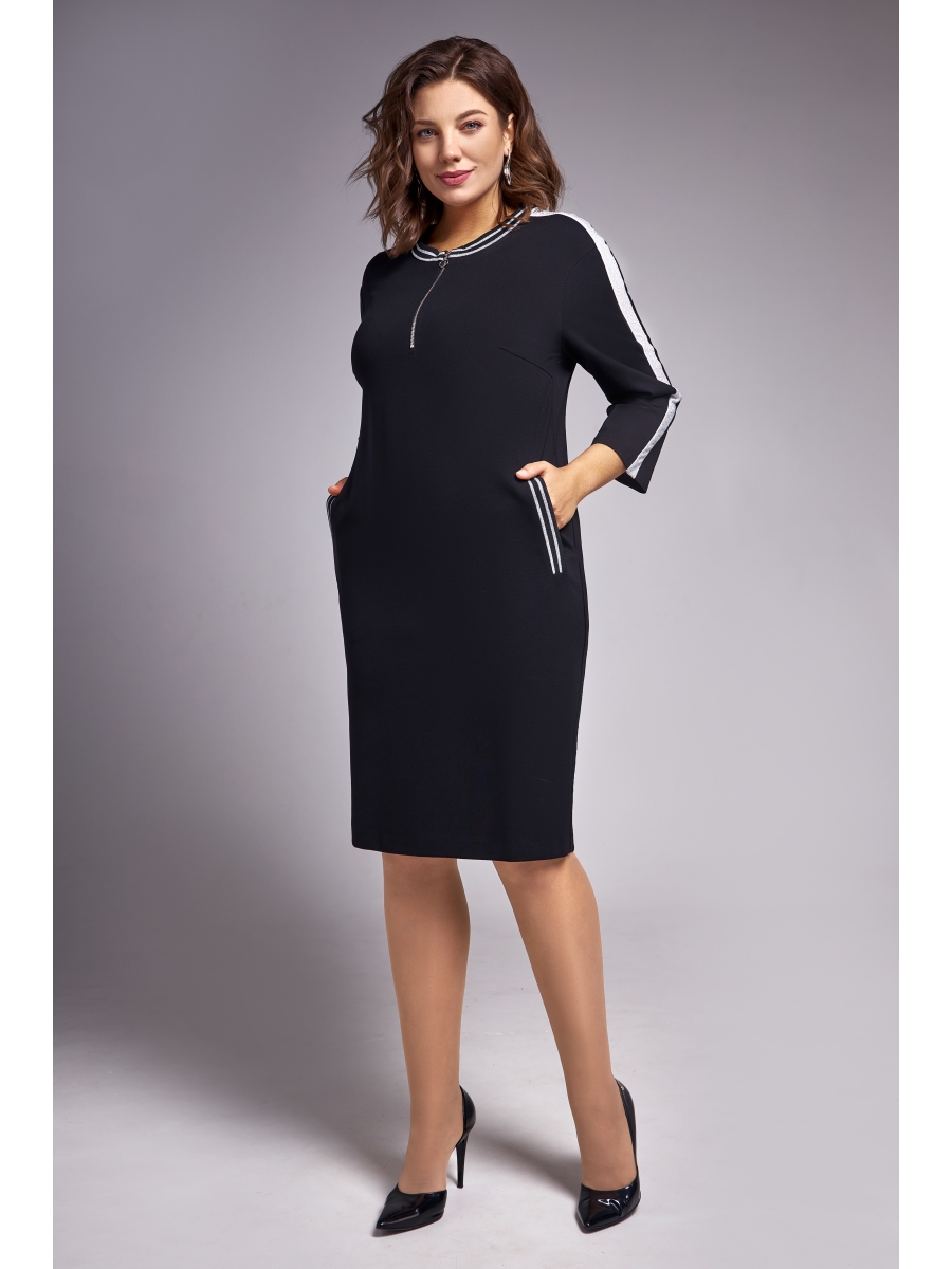 Оформить заказ →Платье прямого силуэта со втачными рукавами; по горловине переда декоративная застежка-молния; по переду прорезные карманы с листочками. В платье вставки из декоративной ткани; листочки и бейка горловины выполнены из довяза.