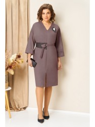 Элегантное лаконичное платье из эластичного трикотажа прямого полуприлегающего силуэта с акцентной V-образной горловиной. Центральный элемент отделки платья - вставки из кожи и необычная съемная брошь для легкости образа. Длина платья немного за колено, уместная в большинстве ситуаций. Спереди небольшой вырез для максимального удобства.