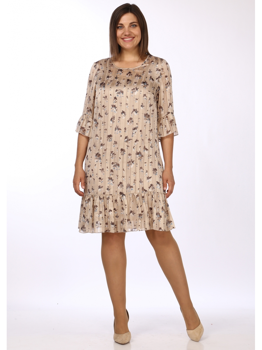 Платье прямого силуэта, с круглым вырезом горловины.Перед с нагрудными вытачками. Спинка с обработанной "капелькой" в среднем шве. По низу платья обработан волан со сборкой. Рукава втачные, одношовные, длиной 3/4. По низу рукава обработан волан со сборкой.