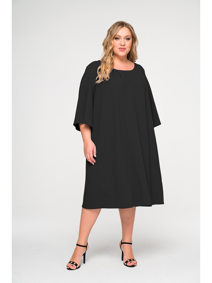 Платье из однотонного крепа трапецеевидного силуэта. По вырезу горловины заложены мягкие складки, вырез округлый. Рукав расклешенный.