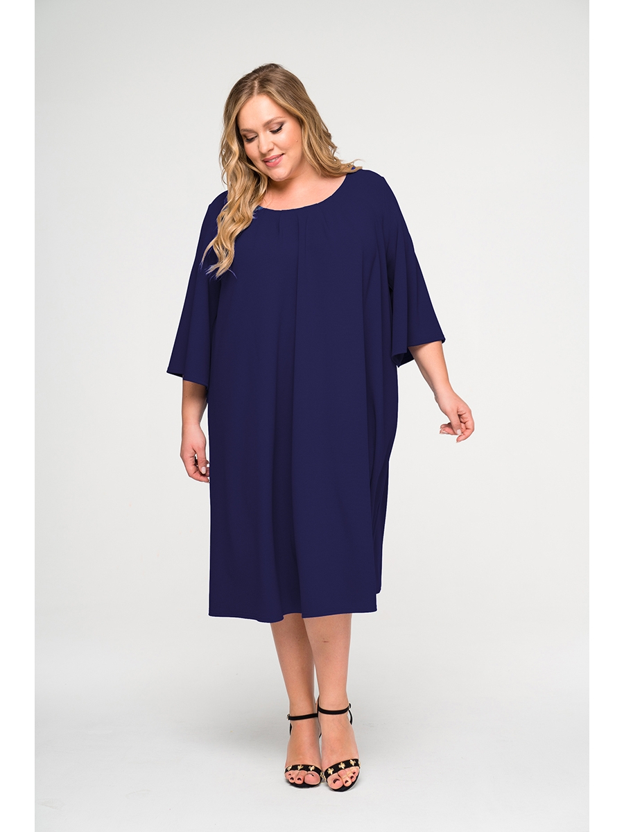 Платье из однотонного крепа трапецеевидного силуэта. По вырезу горловины заложены мягкие складки, вырез округлый. Рукав расклешенный.