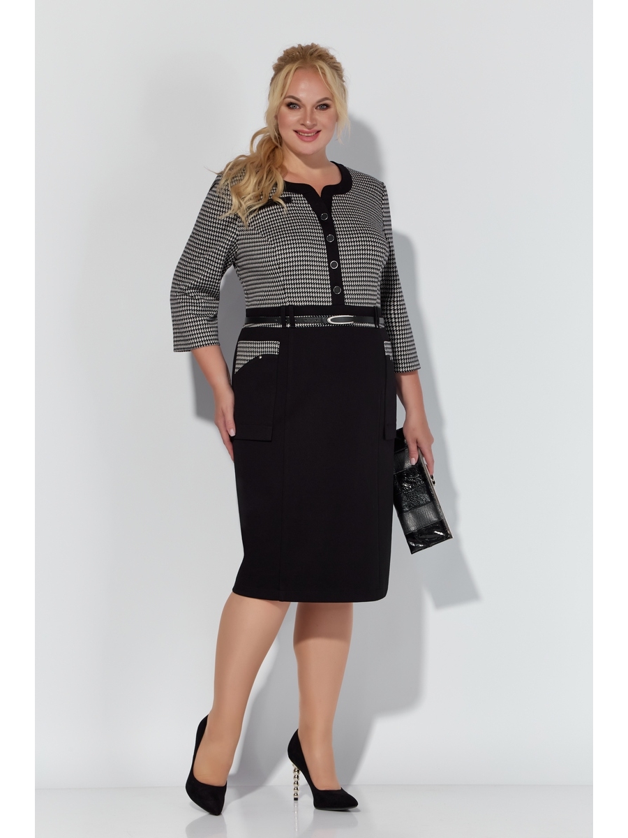 Платье женское, прямого, слегка приталенного силуэта, выполнено из комфортного трикотажного полотна, однотонного и с дизайном «гусиная лапка». Вырез горловины округлый, обработан притачной бейкой, застежка центральная, на планку с петлями-пуговицами. На уровне талии выполнены 2 горизонтальных подреза имитирующих пояс, по ним расположены шлевки. К платью прилагается пояс из экокожи. По переду изделия выполнены рельефы. По нижней части на уровне бедер выполнены карманы с фигурными подрезами. Спинка повторяет подрезы на уровне талии, как по переду. По нижней части выполнен средний шов со шлицей. Рукав втачной длиной 3\4. По низу рукава выполнена пата с пряжкой.