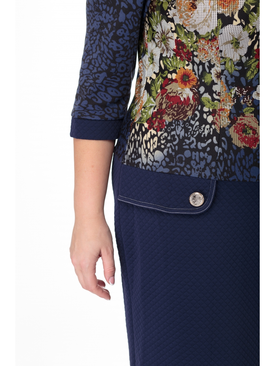 Платье из трикотажного полотна с компаньоном по цветовому решению. Без подкладки. Полуприлегающий силуэт, отрезное по линии бёдер. Верхняя часть переда и спинки, втачной рукав 3/4длины-из полотна с цветочным принтом. Нижняя часть платья, клапаны переда, отделочная деталь горловины округлой формы и манжеты рукавов выполнены из однотонного трикотажного полотна. Отличный выбор для каждого дня!