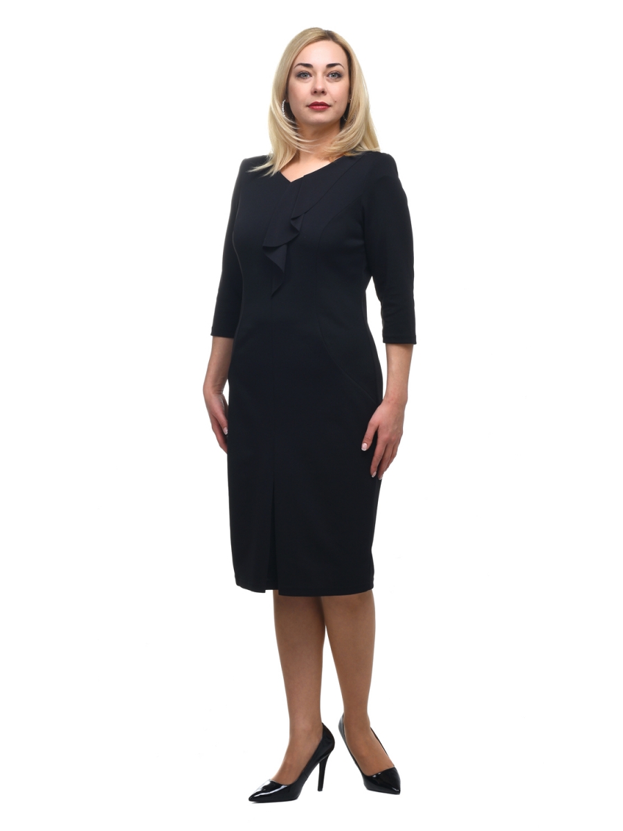 Элегантное платье длиной чуть ниже колен, из плотной тонкой ткани. Модель полуприлегающая, чуть зауженная книзу, с разрезом-шлицей спереди; с втачными рукавами 3/4; V-образным вырезом, декорированным оборкой-галстуком. Обволакивающий крой и эластичная ткань хорошей плотности придают плавность линиям силуэта и изящество, идеальный баланс стиля и комфорта делает платье незаменимым для базового гардероба.