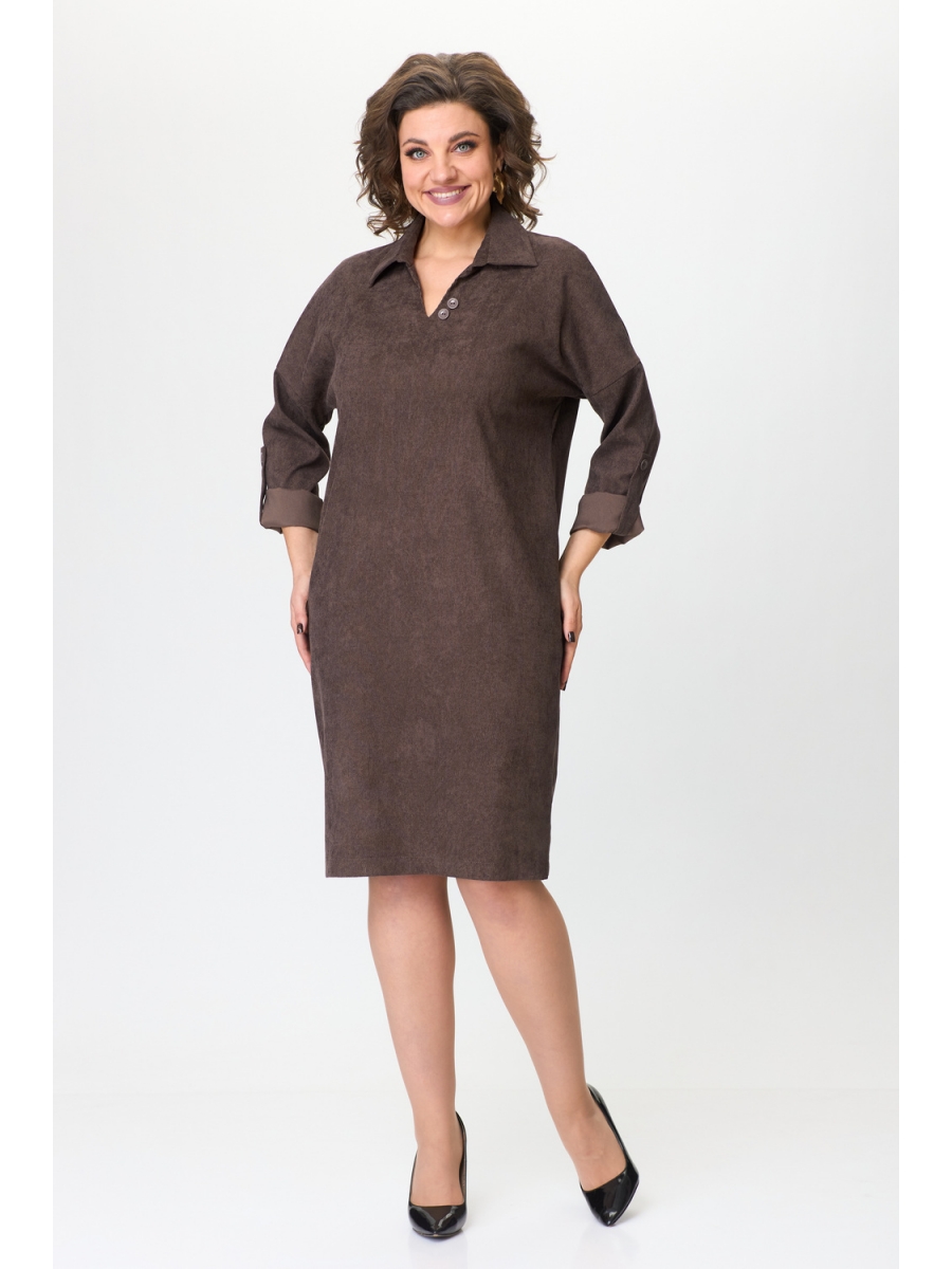 Платье женское полуприлегающего силуэта с цельнокроеным рукавом. Горловина фигурная с отложным воротником на стойке. Рукав длинный регулируется по низу патой с застежкой на пуговицу. Спинка со швом посередине и разрезом по низу.