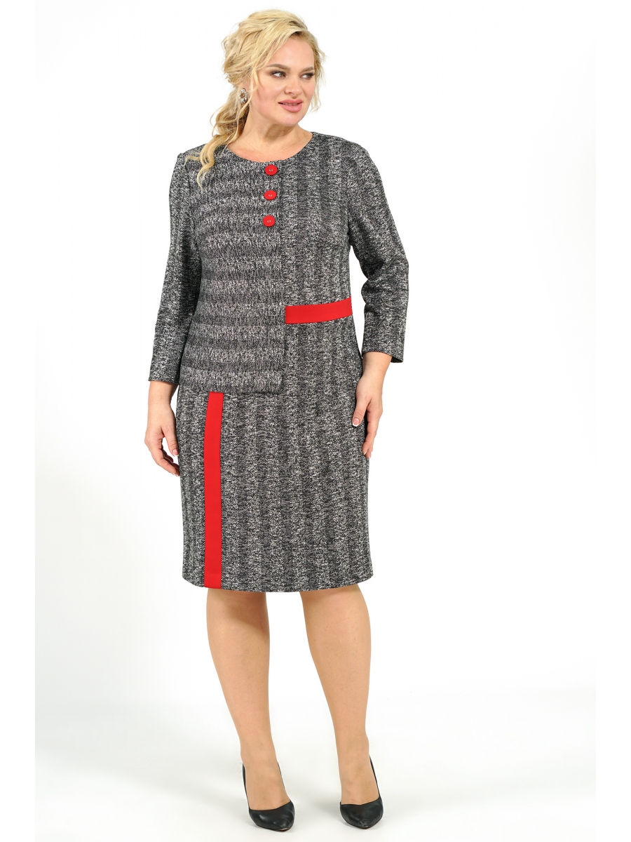 Платье женское полуприлегающего силуэта, с застёжкой на навесную петлю и пуговицу по спинке. Перед с нагрудными выточками, по правой стороне с ассиметричным подрезом с имитацией застёжка верху на три пришивные пуговицы, понизу с цельнокроеной отлетной планкой. По левой стороне отделочная деталь на уровне линии талии и вертикальная отделочная деталь, смещенная в право выполнены из отделочной ткани. Спинка со средним швом заканчивающийся шлицей. Рукава двухшовные, длиной ¾.