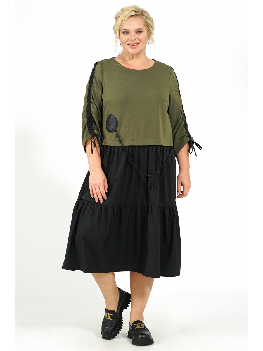 Платье женское полуприлегающего верху силуэта с расширением к низу, отрезное чуть ниже линии талии с фигурной линией, понизу с двумя притачными оборками, по шву соединения со сборкой, с застёжкой по среднему шву спинки на навесную петлю и пуговицу. Перед с нагрудными выточками. Спинка со средним швом. Рукава втачные, одношовные, длиной ¾, по центру с кулисой и продёргивающейся завязкой. Платье декорировано по переду аппликацией «круг» и съёмные отделочные шнуры с бусинами фиксируемые на два карабина.