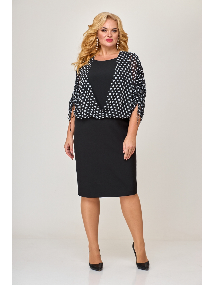 Платье полуприлегающего силуэта, отрезное чуть ниже линии талии. Верхняя часть нижнего платья с рельефными швами по переду и талиевыми вытачками по спинке, без рукавов. Верхняя часть платья из шифона, свободного силуэта, с втачными рукавами, присборенными на кулису. Верхняя часть платья, которая из шифона, соединена с нижней по линии подреза чуть ниже линии талии.