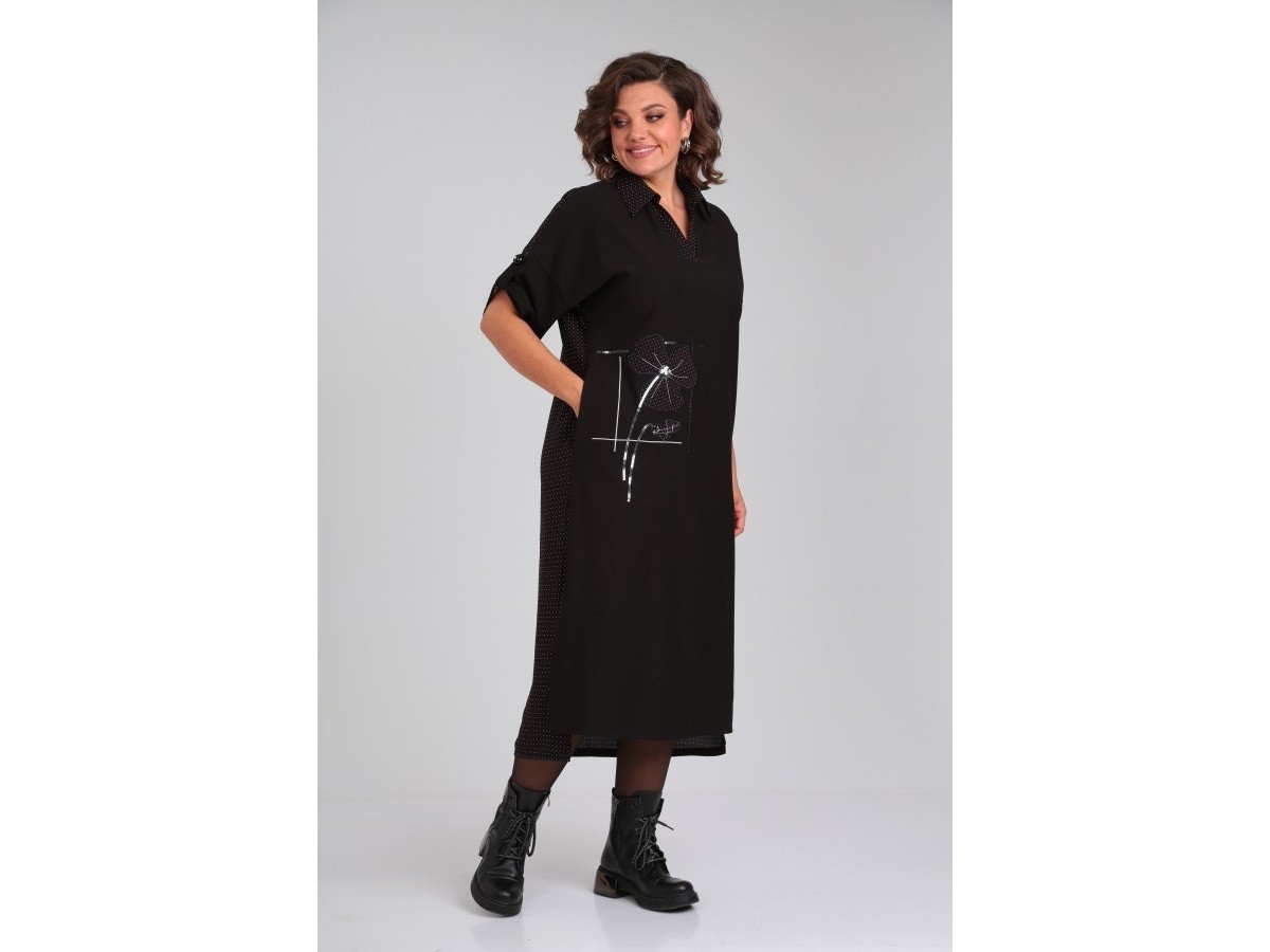 Универсальное платье в стиле «casual». Изделие выполнено из двух скомпонованных материалов — однотона и гороха. Перед и спинка цельнокроеные, спинка длиннее переда. Горловина с рубашечным воротником и V-образным вырезом. Плечо спущенное, рукав втачной длиной 3/4, застегивающийся на пату и пуговицу. По верху спинки имеется стачная встречная складка, благодаря которой имеется небольшое клешение. По переду платье украшено вышивкой из пайеток. В боковых швах имеются карманы, а также боковые разрезы. Изделие может сочетаться как с кедами, лоферами, так и туфлями. Универсальность и практичность платья сделают его любимым в Вашем гардеробе в наступающем осеннем сезоне.