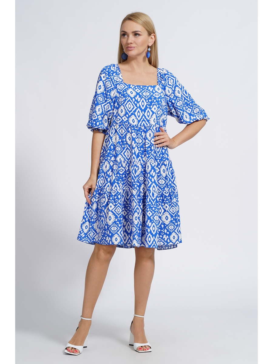 Платье отрезное чуть выше линии талии и тремя притачными оборками со сборкой по линии соединения, с имитацией бретели на продолжении проймы собранная на резинку. Перед с нагрудными выточками. Спинка со средним швом. Рукава втачные, одношовные, длиной 3/4, объёмной формы за счёт сборки по окату и понизу собранный на резинку от низа 2,5 см. Горловина формы «карэ».