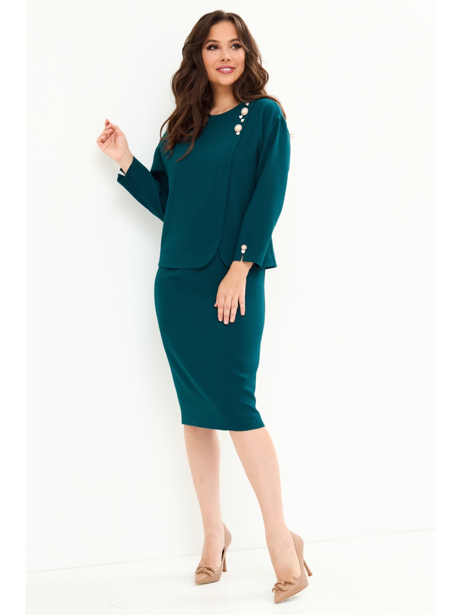Элегантное платье полуприлегающего силуэта. Выполнено как имитация жакета и юбки. Рукав втачной,слегка спущен. Платье выполнено из эластичной плательной ткани. Застежка по спинке на потайную молнию.
