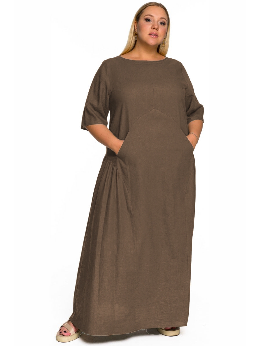 Платье длинное, свободного силуэта, из смесовой ткани, содержащей в составе лен и вискозу. Нижняя часть платья отрезная, присборенная. Линия подреза по переду фигурная, по спинке горизонтальная. В швам подреза обработаны карманы. Рукав втачной, свободный.