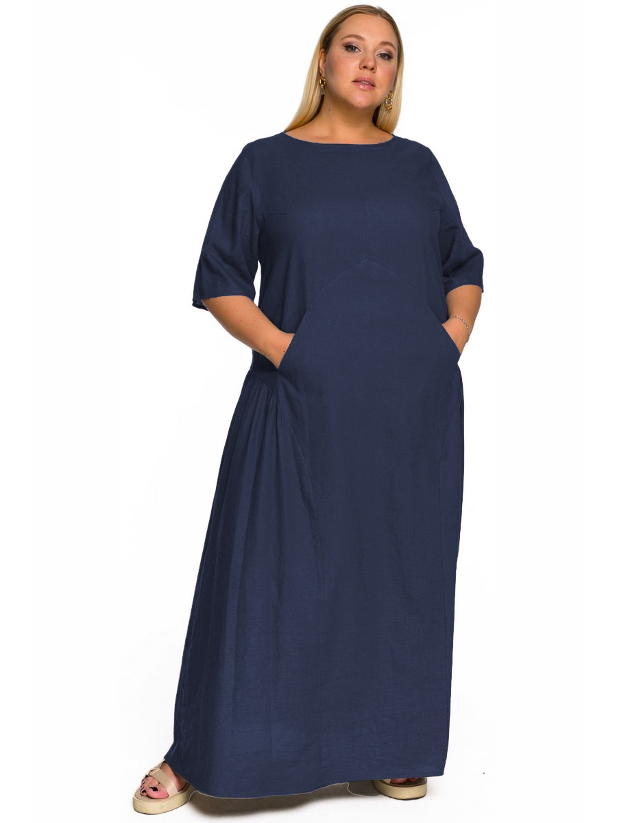 Платье длинное, свободного силуэта, из смесовой ткани, содержащей в составе лен и вискозу. Нижняя часть платья отрезная, присборенная. Линия подреза по переду фигурная, по спинке горизонтальная. В швам подреза обработаны карманы. Рукав втачной, свободный.