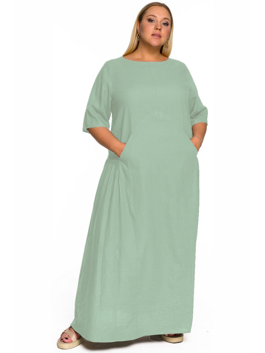 Платье длинное, свободного силуэта, из смесовой ткани, содержащей в составе лен и вискозу. Нижняя часть платья отрезная, присборенная. Линия подреза по переду фигурная, по спинке горизонтальная. В швам подреза обработаны карманы. Рукав втачной, свободный.