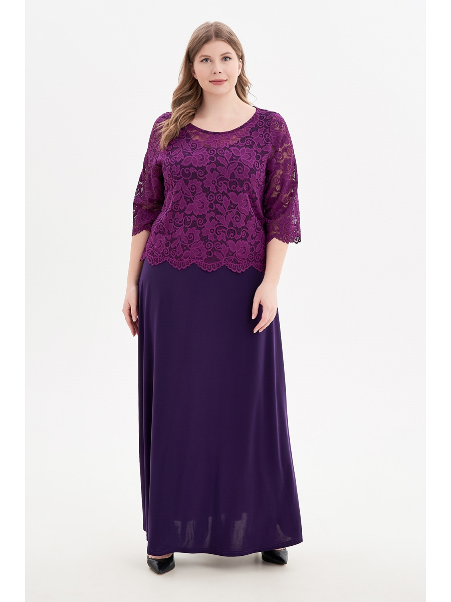Эффектное многослойное платье макси, выполненное в комбинации струящегося трикотажа-масло и гипюра. Верх изделия в виде кружевного болеро с ажурным низом и обшлагами рукавов 3/4; с круглым вырезом горловины, надетого на полуприлегающий сарафан с глубоким вырезом «подкова» спереди и сзади. Модель придает образу женственность и мягкость, зрительно удлиняет ноги, делает силуэт грациозным. Драпировка нижней части изделия скрадывает формы.