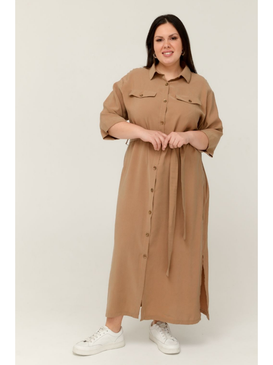 Повседневное платье больших размеров из мягкого приятного на ощупь текстильного полотна. Отложной воротник, рукав 3/4, пояс в комплекте.