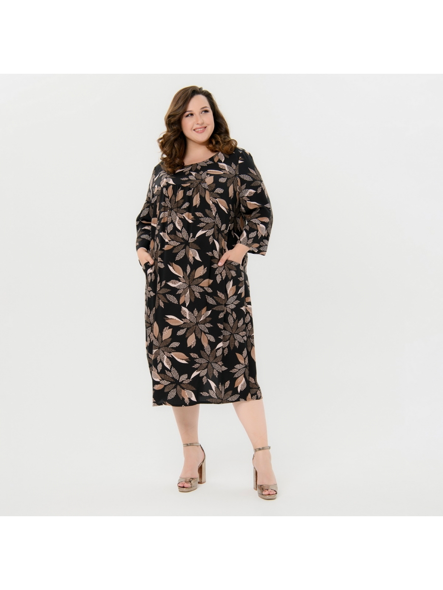 Платье из штапеля прямого силуэта. Вырез горловины округлый. По переду фигурные рельефные швы, в которых обработаны карманы.