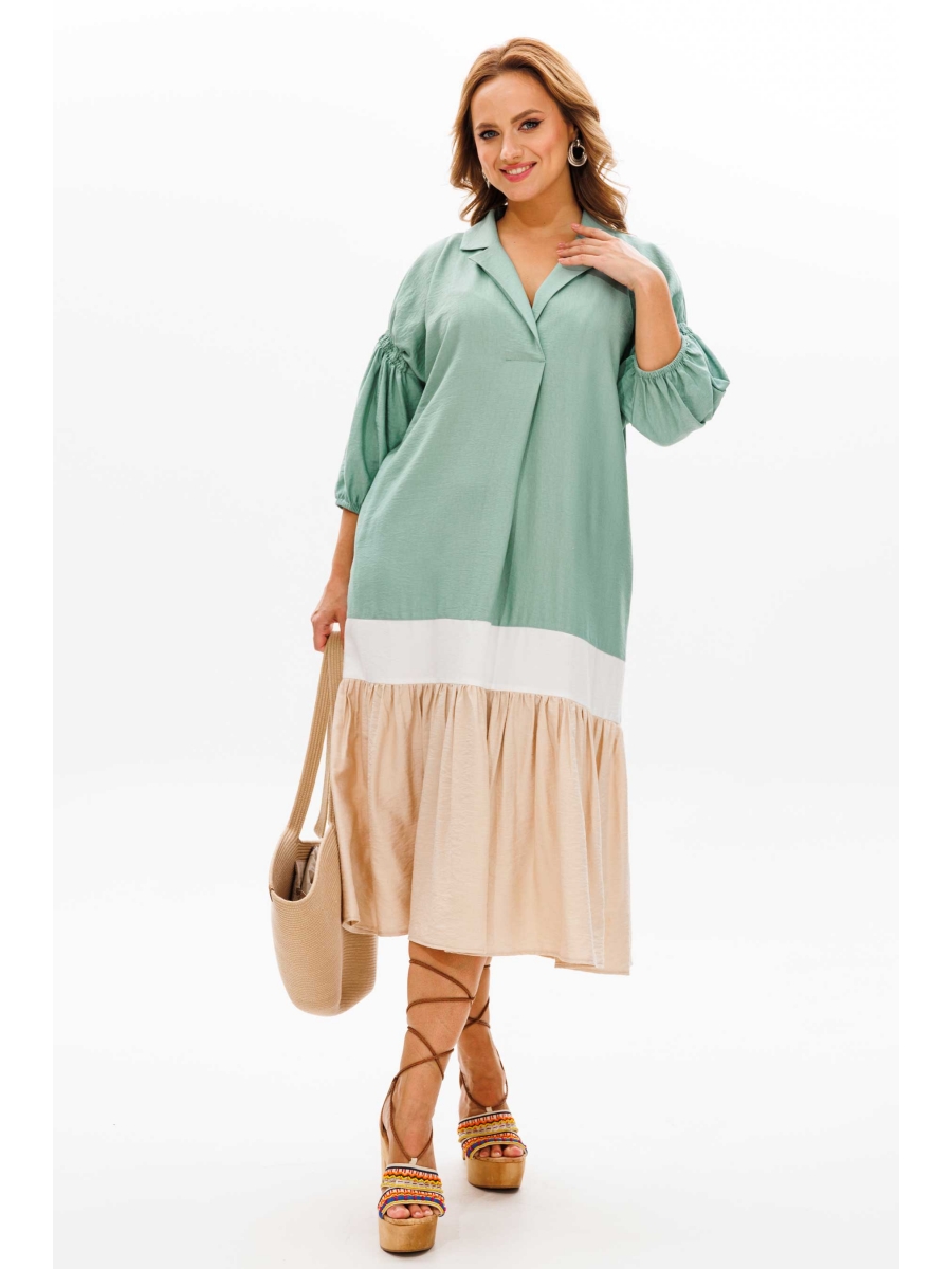 Платье женское свободного силуэта. Воротник пиджачного типа. По переду заход бортов переходит в фасонную складку. Низ юбки платья со вставкой и присборенным воланом. Рукав спущенный, по линии приталенная сборка на венгерку. К низу расширенный рукав на резинке.