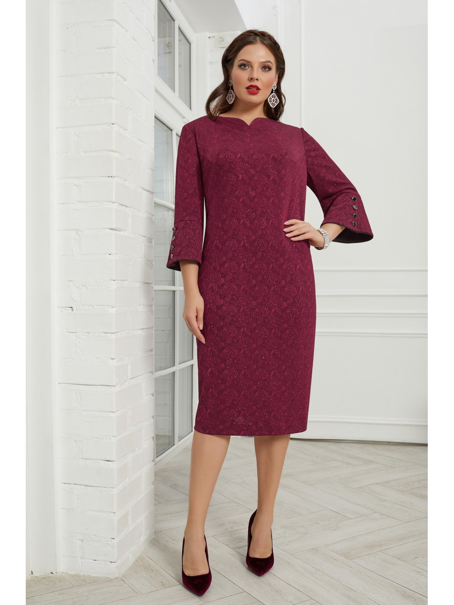 Эффектное платье прямого силуэта с фигурным вырезом выполнено из мягкого жаккардового трикотажа отлично впишется в ваш гардероб. Перед оформлен нагрудными вытачками из проймы. Спинка со средним швом и талиевыми вытачками по низу шлица, вверху разрез с застежкой на навесную петлю и пуговицу. Рукав втачной с притачным воланом с пришитыми пуговицами, в шов обтачивания волана вставлен кант.