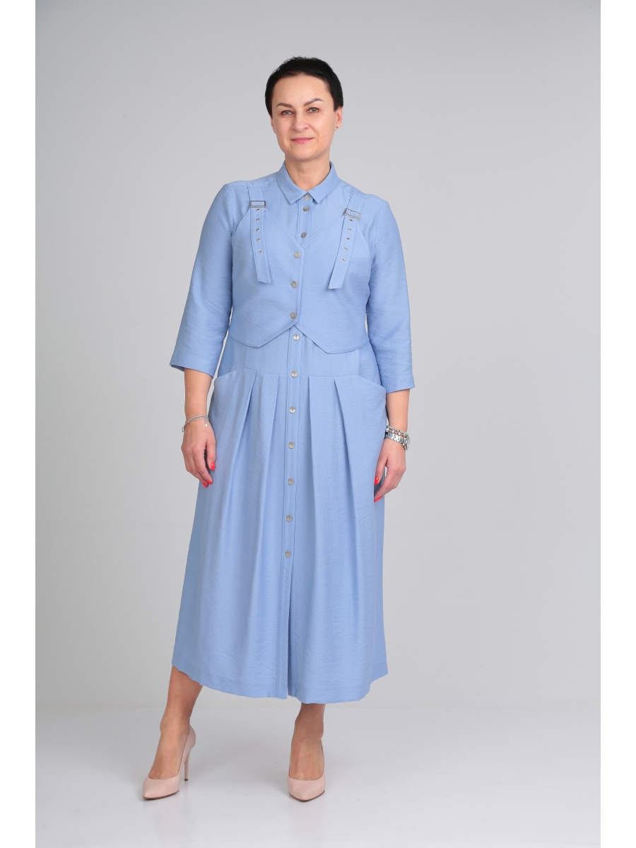 К платью предлагается сьемный жилет, который крепится на лямках с пряжками из плечевого шва и застегиваеся аналогично по спинке. По центру застежка на три пуговицы с петлями. Спинка из пяти частей. Лиф с двойной кокеткой, подрезные бочки, по юбке три складки. Воротник на стойке с острыми отлетами. Рукав до локтя, одношовный, втачной, низ обработан в чистый край.