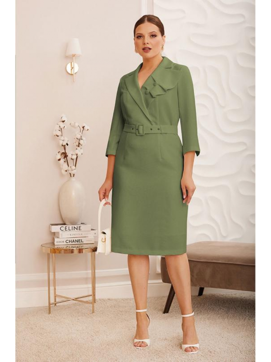 Платье со стояче-отложным воротником пиджачного типа и дизайнерским отлётом воротника с пуговицами с одной стороны. На уровне талии съёмный пояс из основной ткани. Изделие отрезное по талии и потайной молнией в боковом шве. Спинка с талиевыми вытачками и шлицей в среднем шве. Рукава втачные. Платье на подкладке от талии.