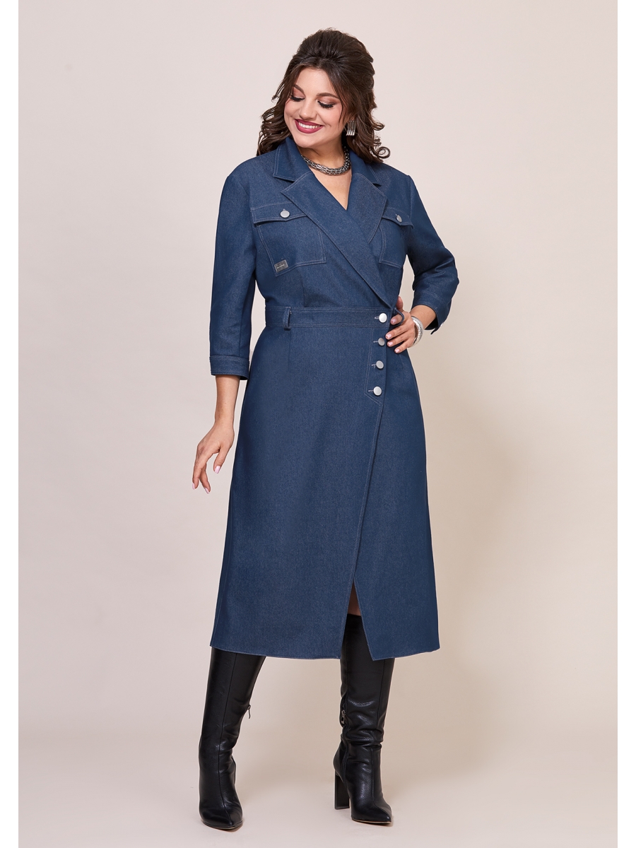 Стильное, женское платье полу-прилегающего силуэта, выполнено из джинсовой ткани. Лиф платья отрезной по линии талии, с втачным поясом. Лиф с V-образным вырезом, горловина обработана воротником пиджачного типа. Также на лифе обработаны накладные карманы с клапаном. Юбка платья А-образного силуэта, с ассиметричной застежкой на петли-пуговицы, по переду разрез. Рукав втачной, оптимальной длины, по низу манжет. Спинка отрезная по линии талии, с втачным поясом, на поясе шлевки, также на спинке обработана кокетка и средний шов, юбка также со средним швом.