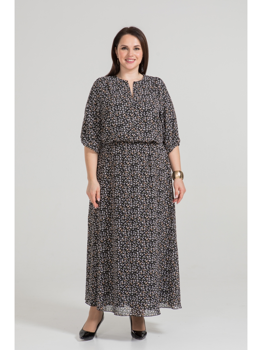 Платье женское А-образного силуэта, отрезное по линии талии, на подкладке. Рукав цельнокроенный, 3/4, со сборкой по окату. Горловина круглая. Верхняя часть переда и спинки с разрезом в среднем шве. Горловина спинки с застежкой на навесную петлю и пуговицу. Нижняя часть переда и спинки полусолнце. Низ рукава и шов талии с эластичной тесьмой.