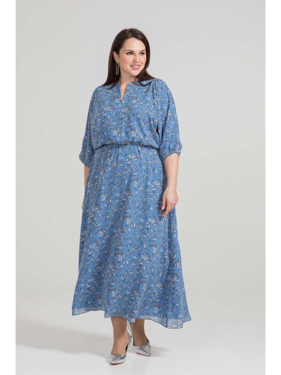 Платье женское А-образного силуэта, отрезное по линии талии, на подкладке. Рукав цельнокроенный, 3/4, со сборкой по окату. Горловина круглая. Верхняя часть переда и спинки с разрезом в среднем шве. Горловина спинки с застежкой на навесную петлю и пуговицу. Нижняя часть переда и спинки полусолнце. Низ рукава и шов талии с эластичной тесьмой.