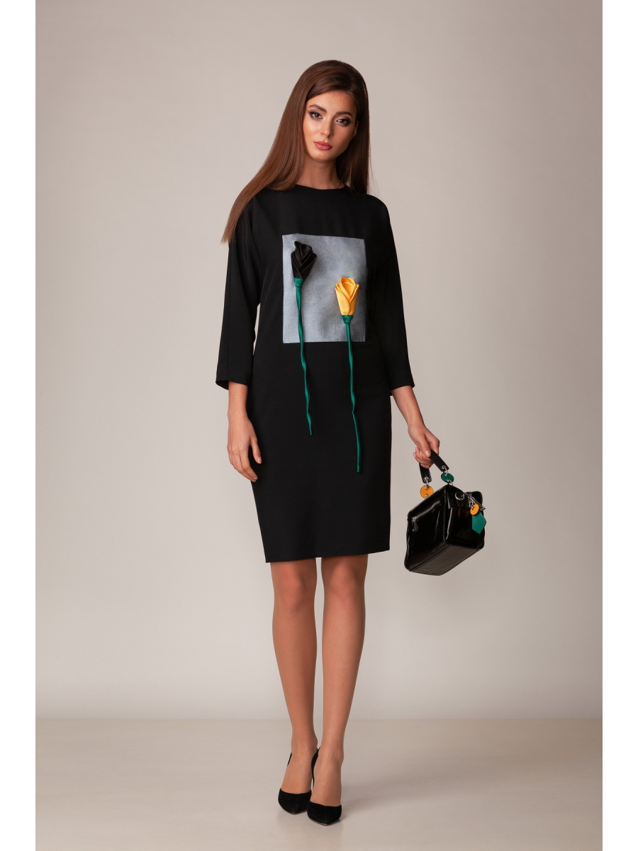 Платье силуэта «летучая мышь» из плательной стрейчевой ткани. Классический черный в сочетании со вставкой из кожи оттенка серебра и яркими цветами ручной работы из плотного атласа, украшающие перед платья - все это выглядит роскошно и стильно. Молния в среднем шве спинки. Рукава трехчетвертные.