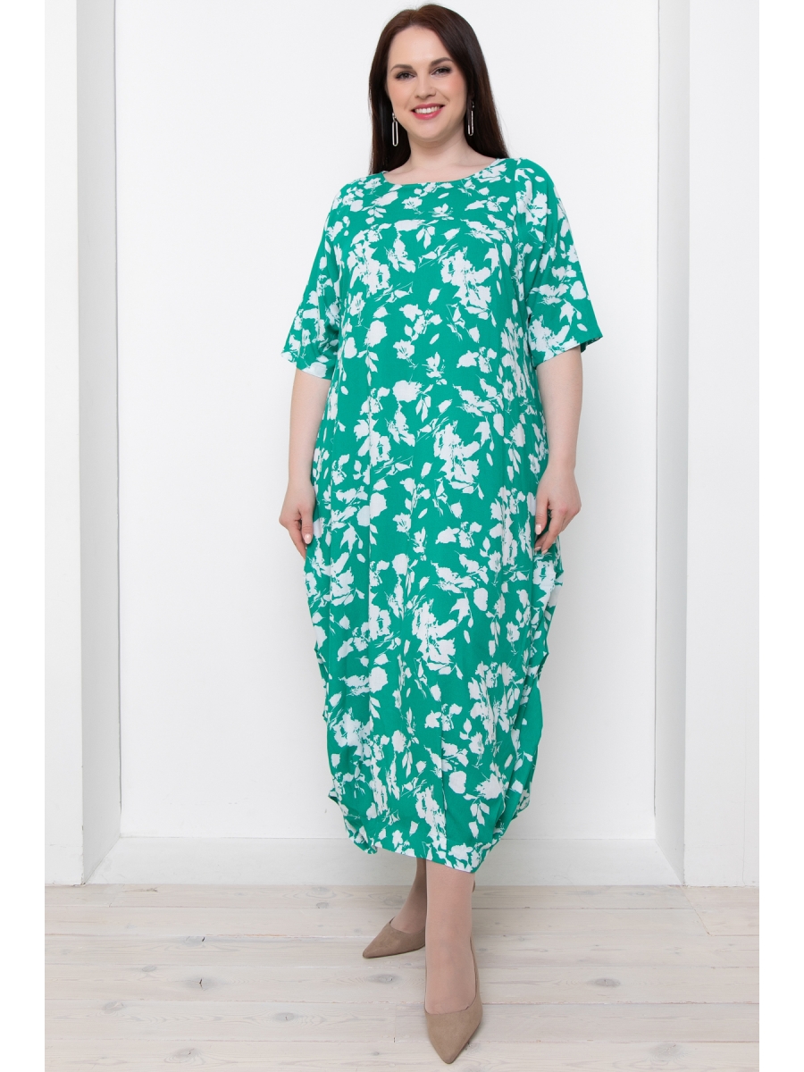 Платье женское трапециевидного силуэта, с карманами и складками в боковых швах. Горловина круглая, рукав втачной, короткий. Изделие изготовлено из штапельного полотна. Размеры сдвоенные.