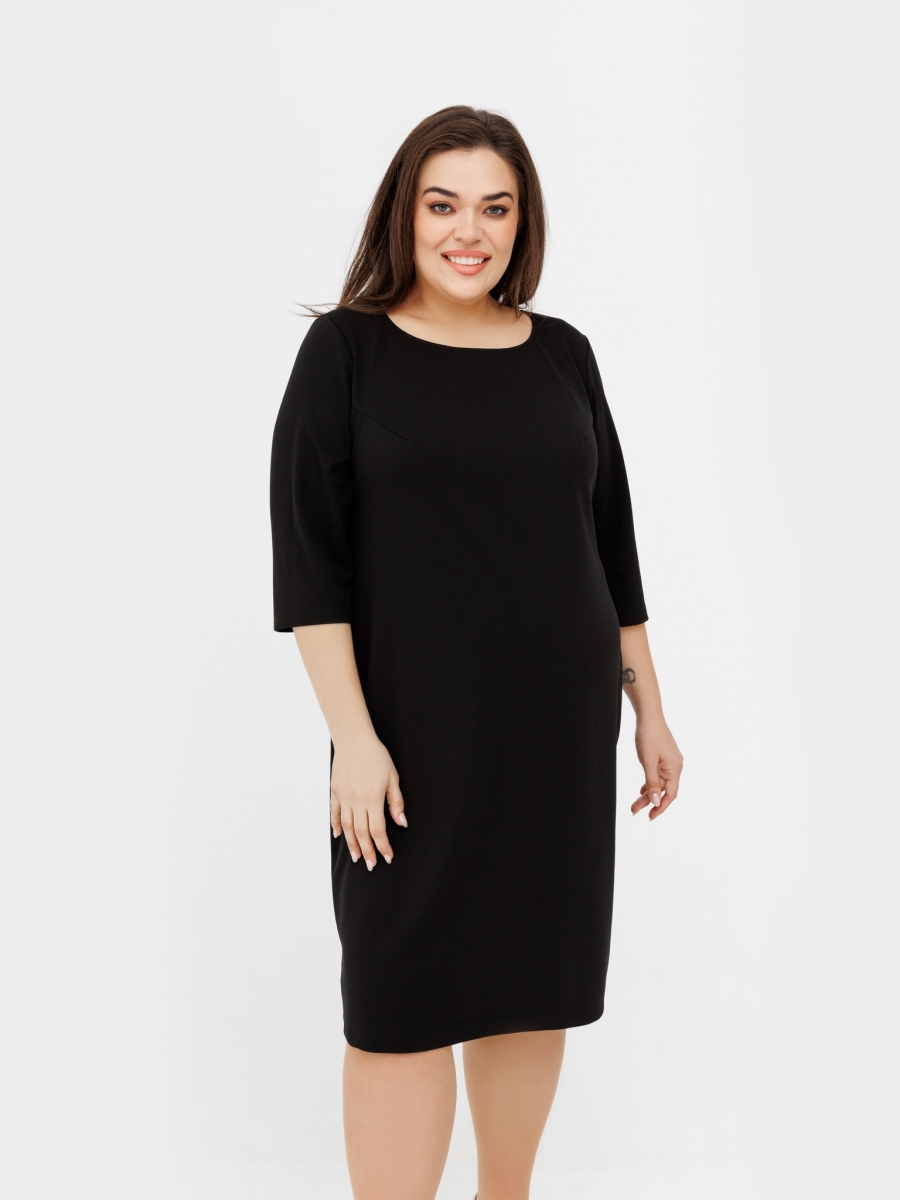 Платье-футляр из трикотажного крепового полотна черного цвета,полуприлегающего силуэта.Рукав 3/4, горловина полукруглая, по спинке средний шов и небольшая шлица. Классическая база для создания любого стиля : от офисного до нарядного.