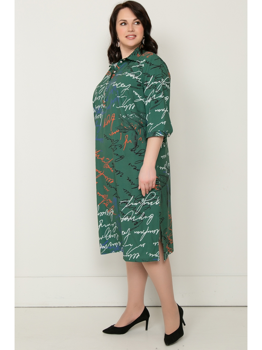 Платье женское прямого силуэта с карманами и разрезами в боковом шве. По переду кокетка и короткая притачная планка, застегивающаяся на петли и пуговицы. Спинка с фигурной кокеткой. Воротник на стойке. Рукав -3/4 с притачной манжетой, застегивающейся на пуговицу.