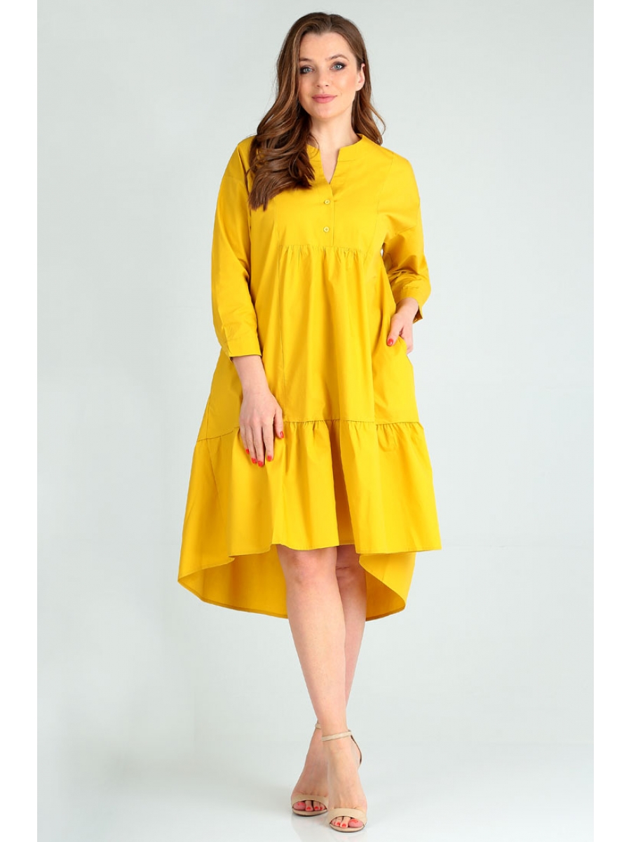 Женское платье оверсайз свободного силуэта с центральной застежкой на фигурную планку, достигающую линии поперечного подреза полочки. Горловина круглая, обработанная двойной обтачкой. Рельефы проходят от плеча вдоль изделия к нижнему волану. Пройма спущена, рукав втачной с притачным манжетом. В боковых швах предусмотрены потайные карманы. От кокетки спинки фигурной формы вниз изделия идет сборка. Низ платья украшен широким воланом на сборке. Перед изделия короче спинки.