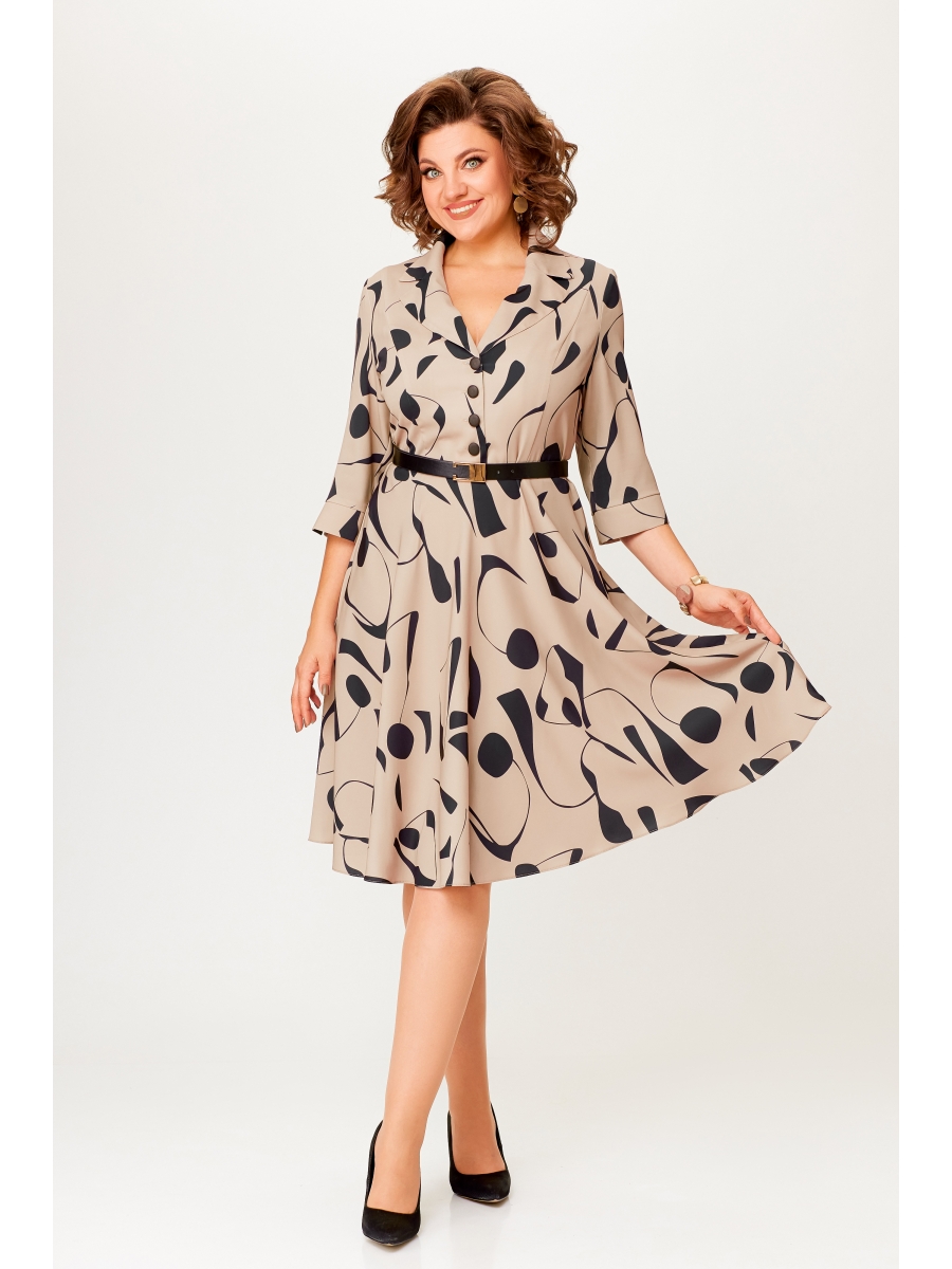 Платье из мягкой, струящейся вискозной ткани, Х-образного силуэта с полуприлегающим лифом. Платье отрезное по линии талии. Перед лифа с вертикальными рельефами и застёжкой на петли и 4 декоративные пуговицы. Горловина V-образной формы, с отложными лацканами и воротником пиджачного типа. Спинка лифа с талиевыми выточками. Рукав втачной, длиной ¾, по низу манжет с разрезом. Застёжка в боковом шве на потайную тесьму молнию. В комплекте пояс из основной ткани.