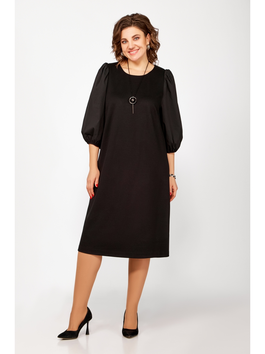 Платье из эластичного трикотажного полотна А-силуэта, с объёмными рукавами из отделочной х/б ткани. Полочка с нагрудными выточками, спинка с центральным швом и разрезом с застёжкой по горловине на навесную петлю и декоративную пуговицу. Горловина круглая, обработана обтачкой. Рукав длиной ¾, по окату сборка, внизу собран на эластичную тесьму (резинку). По боковым швам разрезы длиной 20 см.