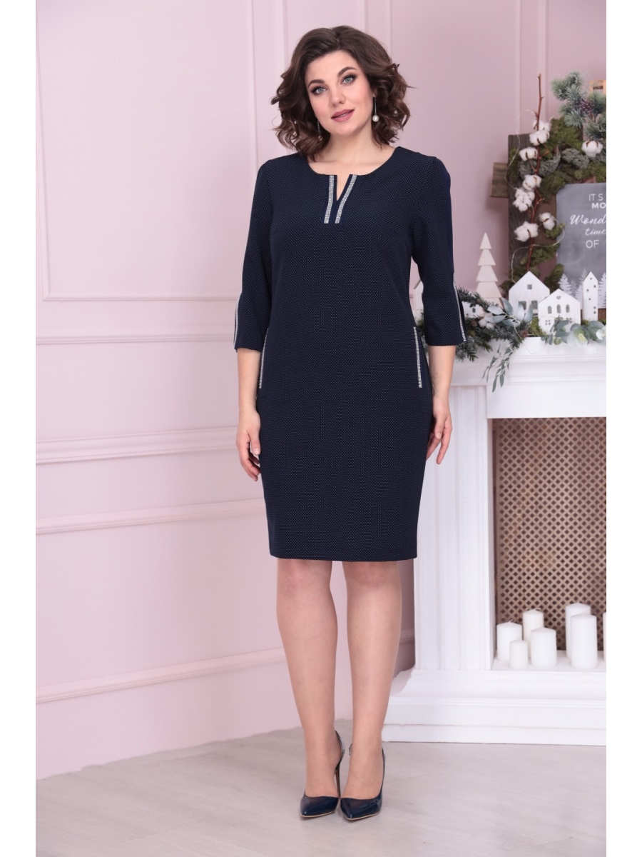 Платье женское из приятной к телу ткани. По переду нагрудные выточки. Горловина округлая, по центру разрез, декорирован однотонной тканью со стразами. Есть карманы-листочки. Рукава ¾ с притачными манжетами с разрезами по центу рукава, так же декорированы однотонной тканью со стразами. По центру спинки потайная молния и талевые выточки, выгодно корректирующую фигуру. Есть шлица.