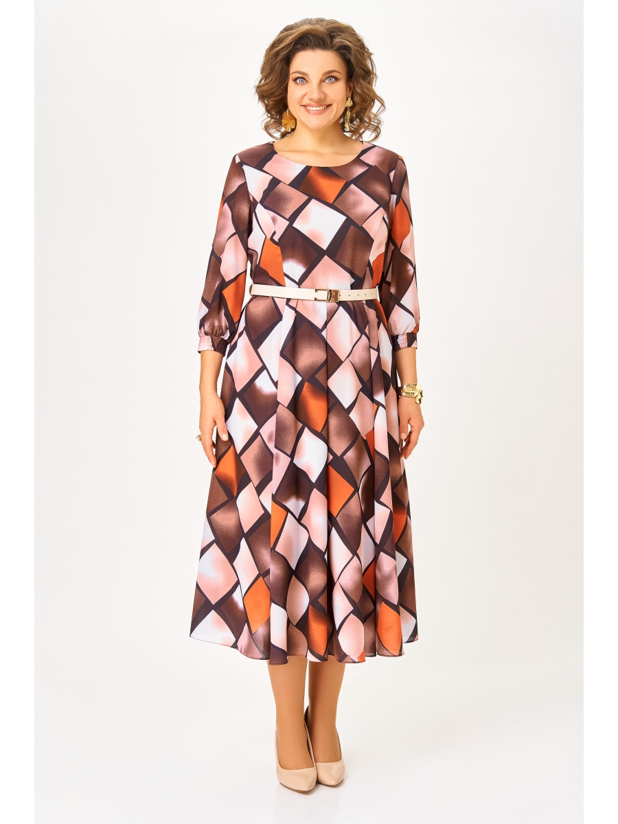 Платье отрезное по линии талии. По переду лифа расположены рельефы, по спинке лифа талиевые выточки. Юбка расклешенная из шести клиньев со встречными складками по линии талии. В среднем шве спинки предусмотрена молния. Рукав втачной длиной ¾, по низу манжета с эластичной вставкой.