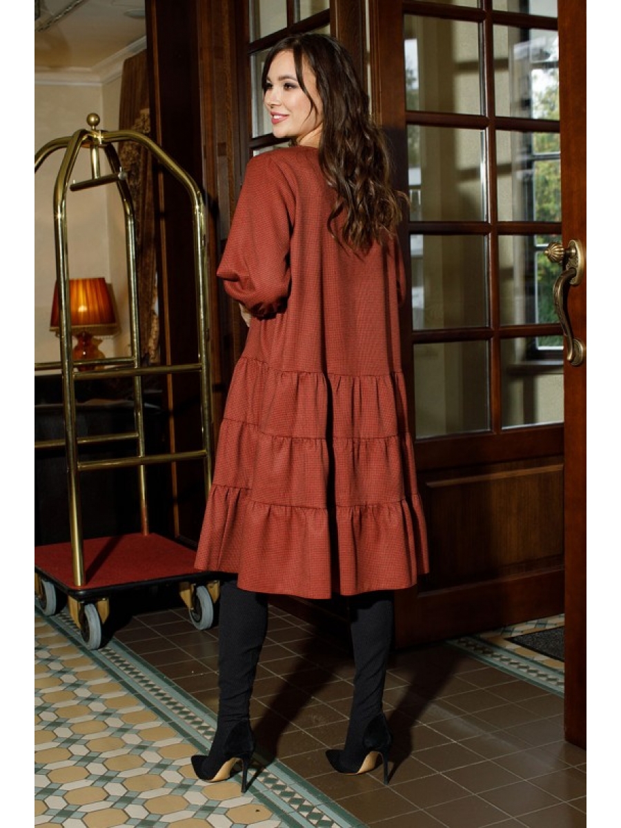 Платье женское из текстильной ткани. Модель трапециевидной формы с 2-мя воланами, рукав 3/4 длины на резинке, вырез круглой формы, окантован.