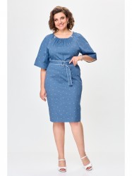 Элегантное женское платье выполнено из хлопка с содержанием эластана. Платье полуприлегающего силуэта. Горловина круглая, собрана на резинку с декоративными бусинам. Застежка в среднем шве спинки на тесьму молния. Рукав реглан, расширенный книзу, длина до локтя.