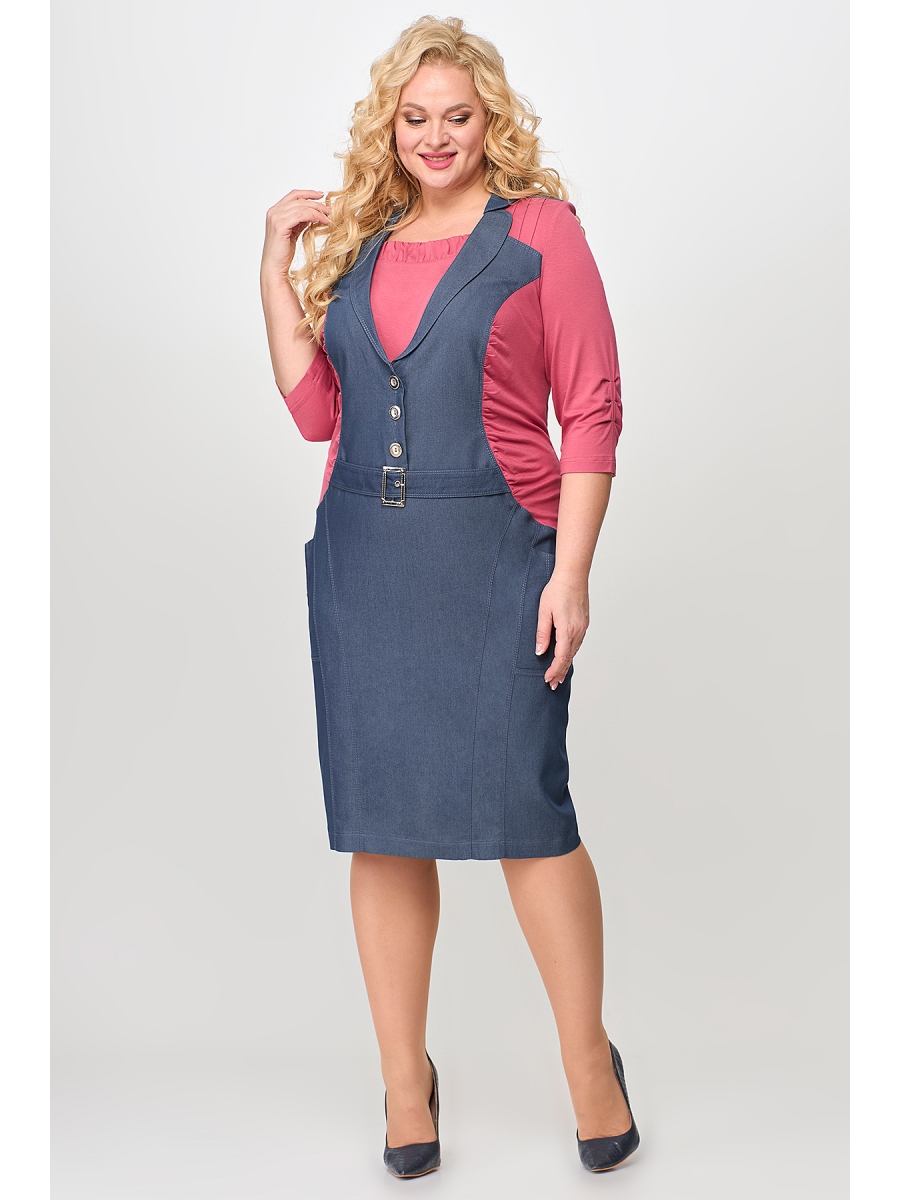 Платье полуприлегающего силуэта в сочетании из двух видов ткани: джинсовой и вискозы, отлично подойдет как в офис, так и на выход. Модель длиной чуть ниже колена. Перед очень красиво разбит на детали и представляет собой имитацию сарафана с нежным отложным воротничком пиджачного типа. По кокеткам отстрочены защипы, по центральной детали - сборка. Чуть ниже талии - декоративный втачной ремень, а также платье с имитацией застежки на 3 металлические пуговки. По переду обработаны удобные и функциональные карманы. Спинка со средним швом и бочками закругленной формы. Рукава втачные, длиной ¾, одношовные. По рукаву внизу заложены 3 небольшие складочки. Материал не тонкий и не толстый, не мнется, скрывает все особенности фигуры.