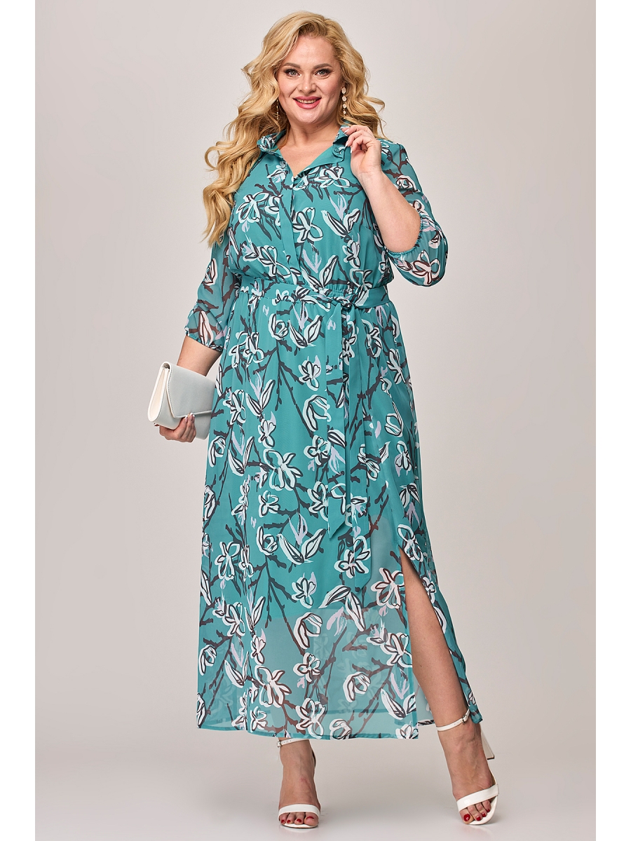 Шифоновое женское платье - незаменимая вещь в гардеробе современной модницы. В наличии платья больших размеров для женщин плюс сайз. Платье прямого силуэта расшыренное к низу, на резинке по линии талии прекрасно скрывает нюансы фигуры и подчеркивает достоинства. На полочке платья обработана потайная застежка. Горловина с воротником на стойке. На платье по рельефу переда юбки обработан разрез. Рукав длинной чуть ниже локтя, низ рукава на резинке. В комплект к платью входит сьемный пояс. Платье шикарно смотрится, как с туфлями на каблуке, так и с кедами, меняйте свой образ в зависимости от настроения и носите его как классическое офисное или как вечернее платье.