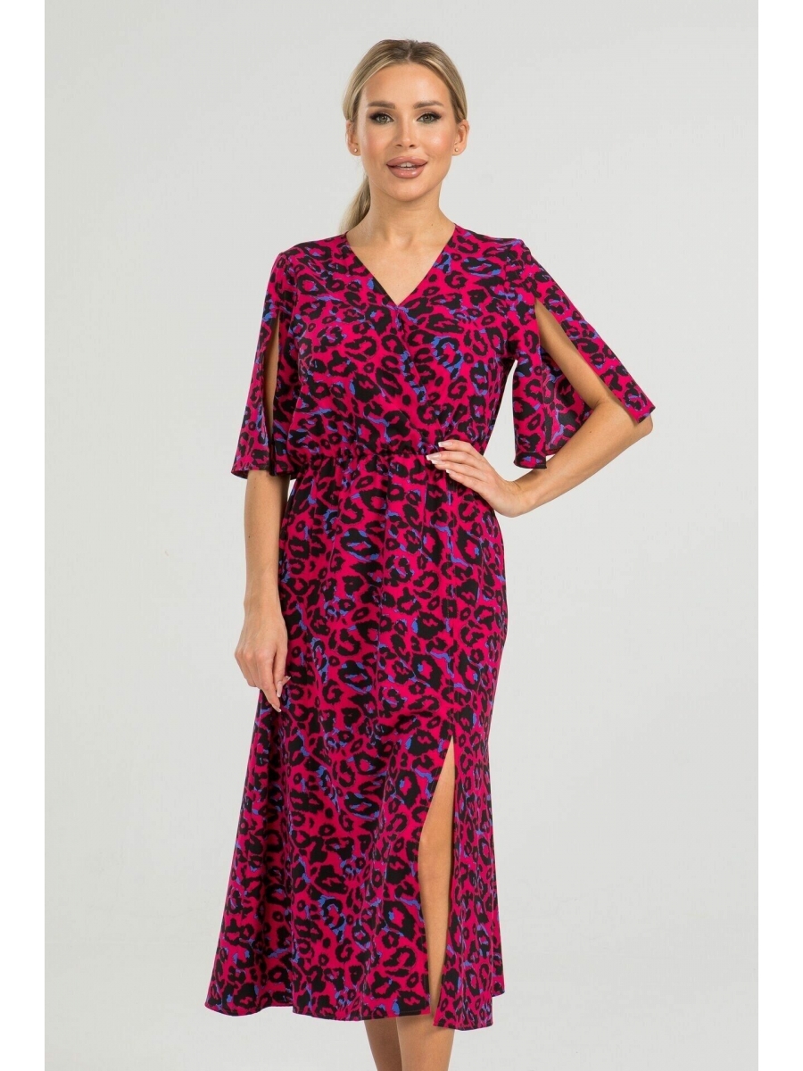 Очаровательное платье из эластичной плательной ткани. Расцветка принт леопард на фуксии. Модель свободного силуэта, подойдет на любой тип фигуры. V-образный вырез горловины. Рукава с разрезами 33 см. В области талии-резинка. По низу спереди разрез. Идеальный вариант на каждый день. Рекомендуемая стирка при t не более 30. Длина изделия в 44 р - 121 см, в 46-48 р - 124 см, в 50-52 р - 129 см, в 54 р - 130 см. Рост модели 168 см, размер изделия 42.