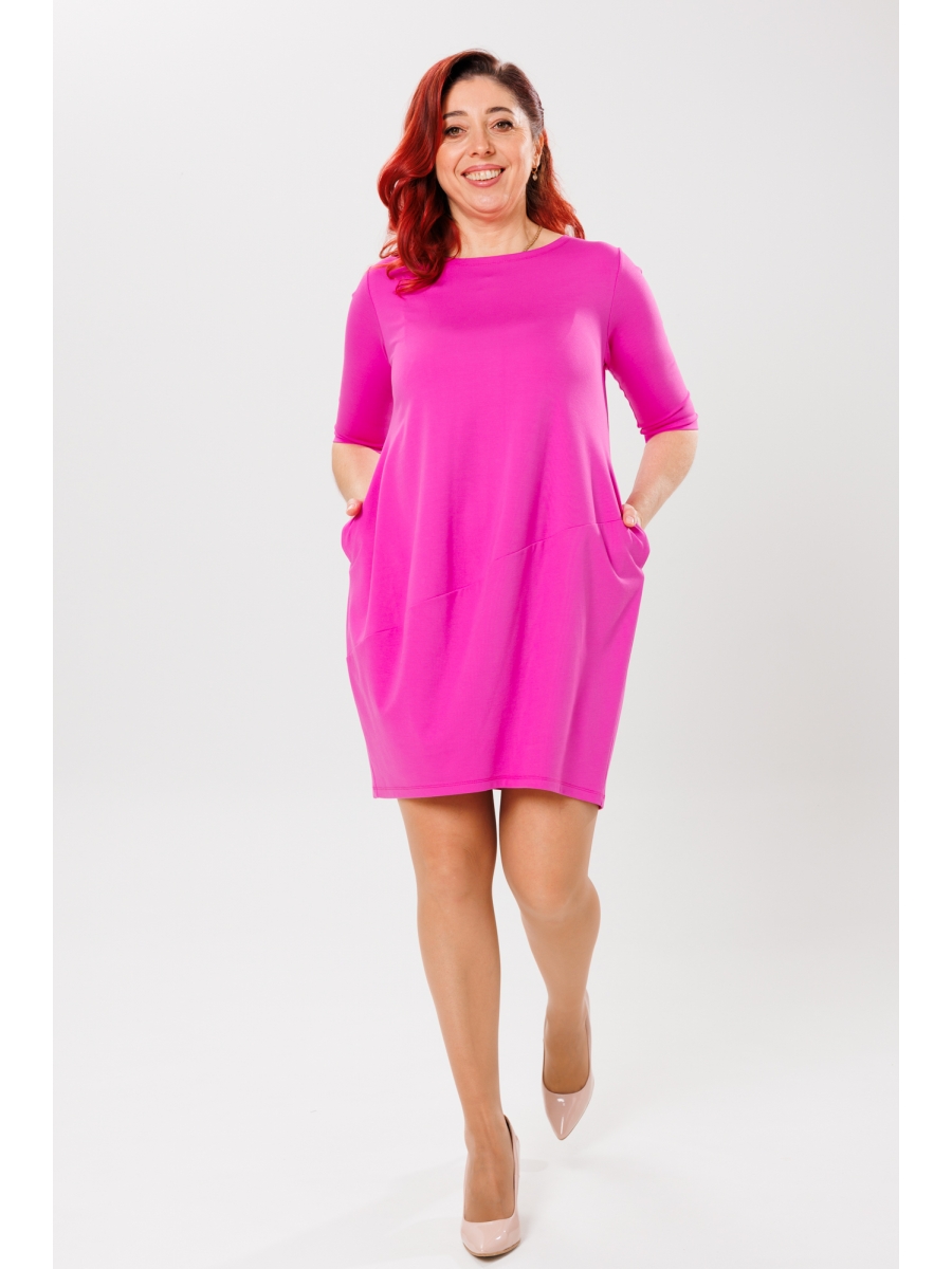 Стильное женское платье-баллон, выполненное из трикотажного полотна (тянется) с легким ненавязчивым блеском. Перед и спинка цельные с косыми подрезами в нижней части. Горловина округлой формы. Рукав втачной одношовный. В боковых швах карманы. Платье без подкладки.