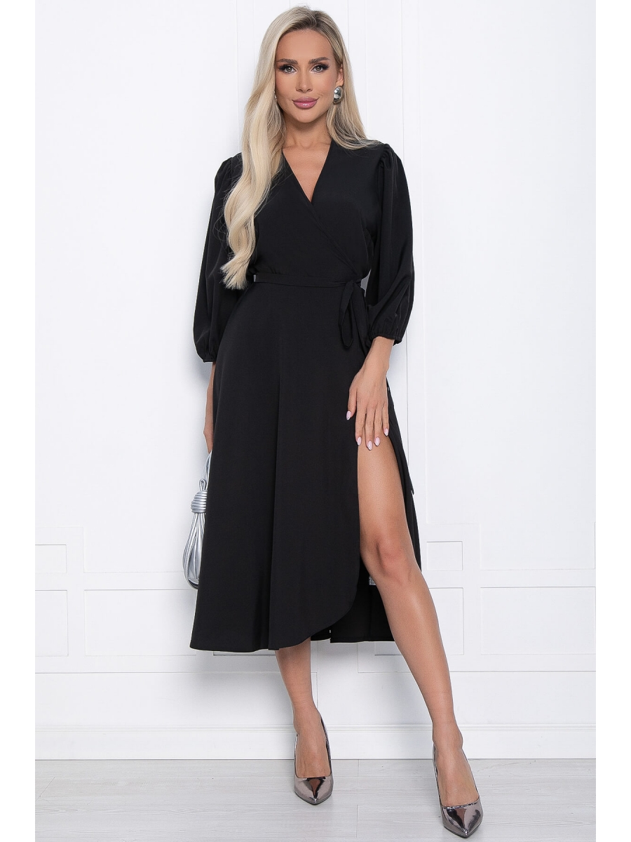 Это элегантное чёрное платье не оставит вас равнодушным. Оно привлекает внимание своим дизайном и создаёт неповторимый образ. Платье имеет втачной рукав, юбку в форме полусолнца с запахом и длинным пояском. Низ рукавов на резинке, а горловина имеет V-образную форму.