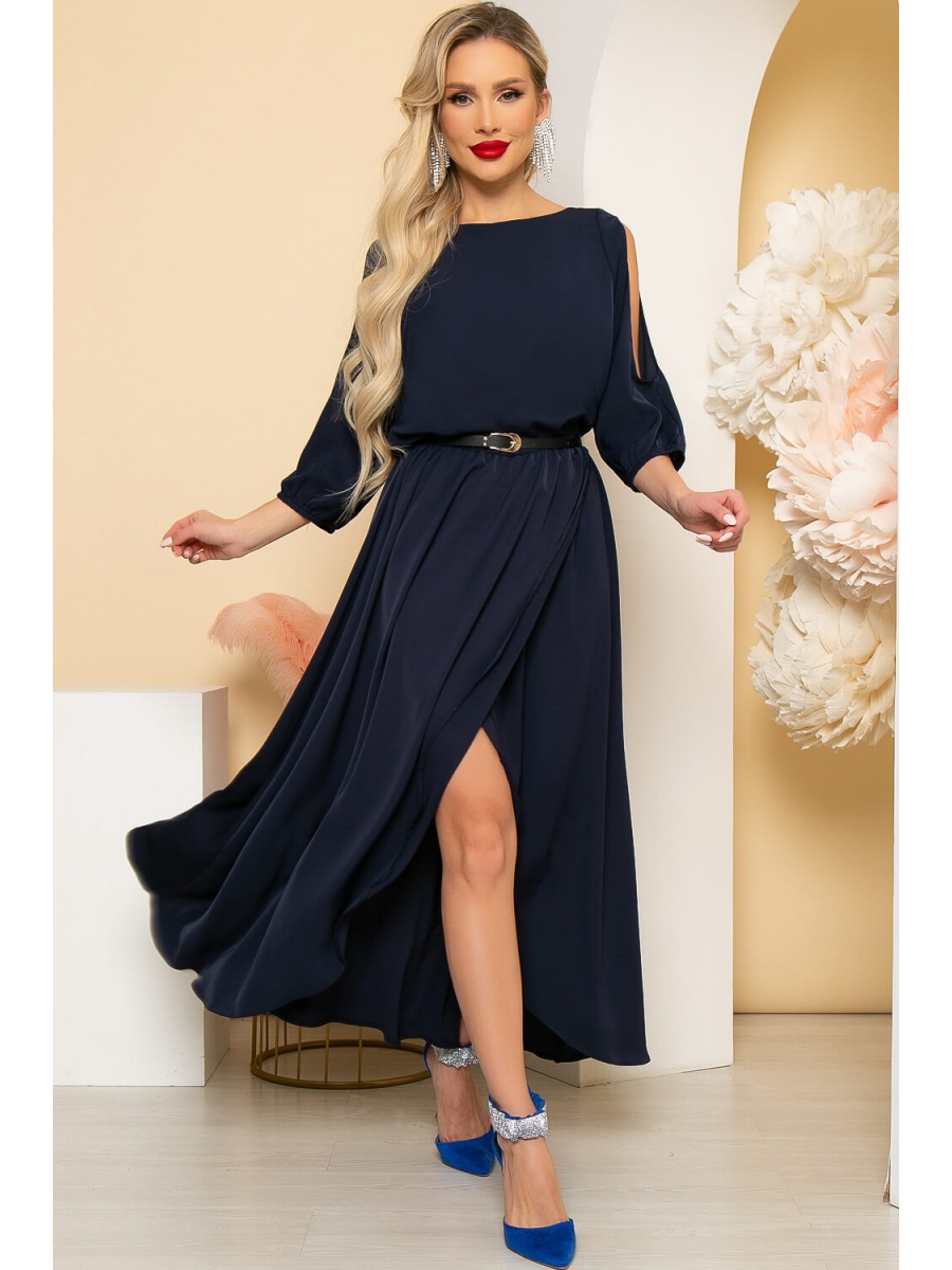 Шикарное макси-платье свободного силуэта с акцентными рукавами. Платье свободного силуэта, талия собрана на резинку и отделяет верх от юбки, скроенной на запах. Рукав втачной, три четверти с овальным вырезом. Горловина - лодочка. В комплекте тонкий пояс с пряжкой.