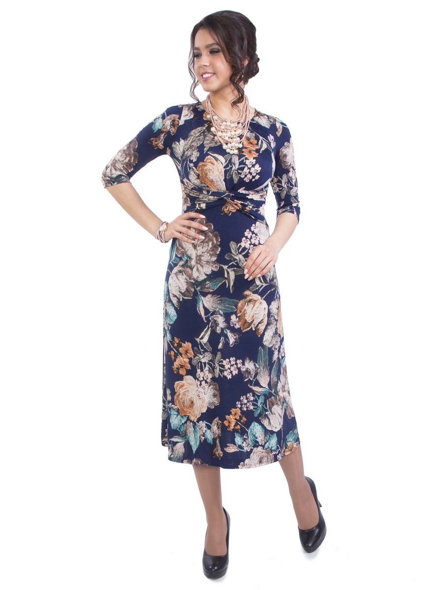 Великолепное платье длины макси полуприлегающего силуэта из трикотажного полотна «масло» сине-бежевого цвета. Круглый вырез горловины изделия обработан внутренней бейкой. Платье с втачными рукавами. Изделие отрезное по линии талии. Линия талии дополнена декоративным втачным поясом с перекрутом.