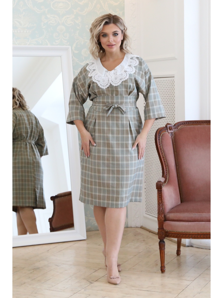Женственное платье полуприлегающего силуэта из текстильго полотна бежево-синего цвета. V-образный вырез изделия обработан внутренней обтачкой и украшен отложным воротником. Цельнокроеные рукава обработаны манжетами. В комплект входит пояс - «кушак». Рост фотомодели — 170 см.