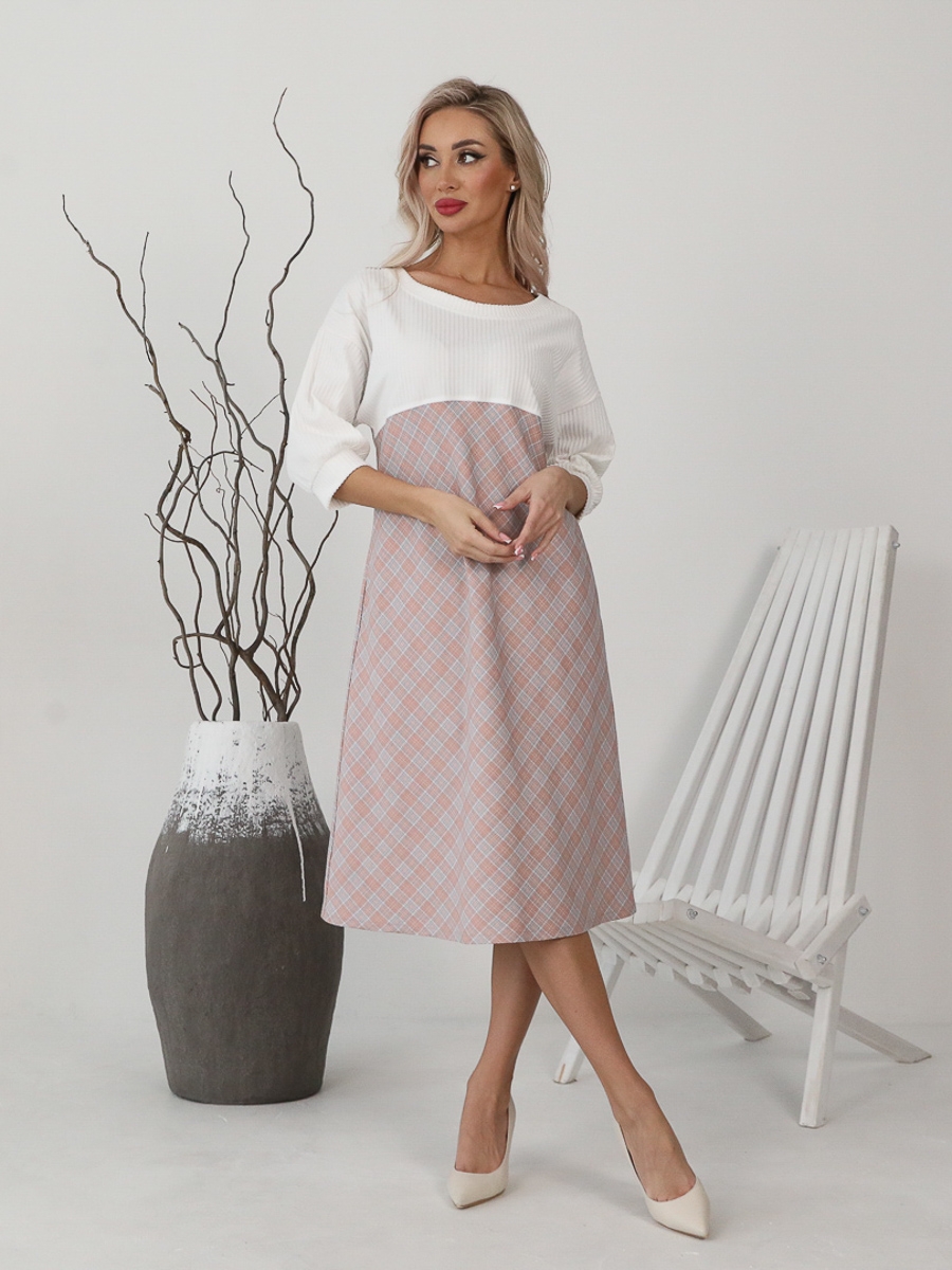 Очаровательное платье полуприлегаюшего силуэта из комбинированного полотна. Верхняя часть платья выполнена в технике ручного вязания, вывязан рисунок «косы». Круглый вырез платья обработан резинкой 1х1 с кеттлевкой. Платье со спущенной проймой и втачными рукавами. По бокам изделия — карманы. Длина изделия по спинке от плечевого шва до низа изделия — 100 см. Аксессуары в комплект не входят.