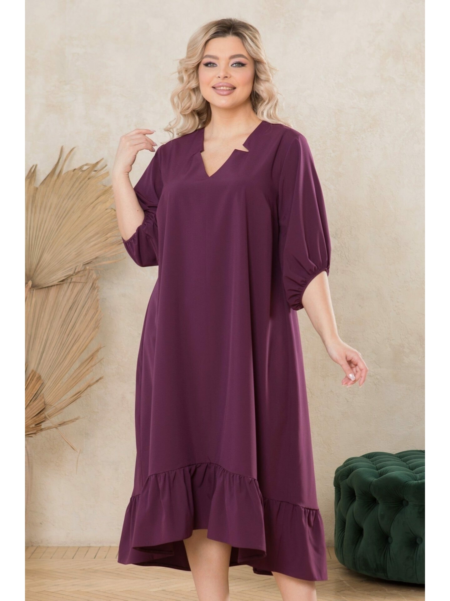 Комфортное платье А-силуэта. Выполнено из однотонного полотна Ниагара. Расцветка марсала. Горловина оформлена фигурным V-образным вырезом. Рукав на сборке 3/4 36 см. Низ оформлен воланом, без разрезов. Легкое платье прекрасно подойдет для прогулок и на каждый день. Рекомендуемая стирка при t не более 30. ДИ в 48-50 р 127 см, в 52-54 р 128 см, в 56-58 р 129 см, в 60-64 р 130 см. Рост модели 168 см., размер изделия 54 р.